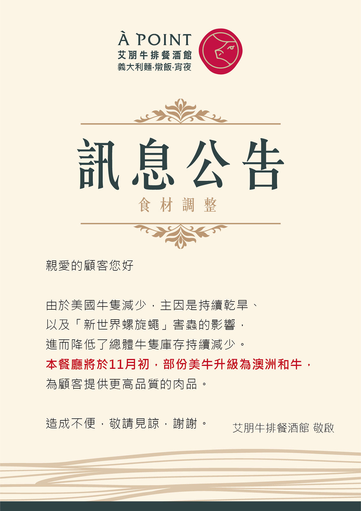 本餐廳將於11月初,部份美牛升級為澳洲和牛,