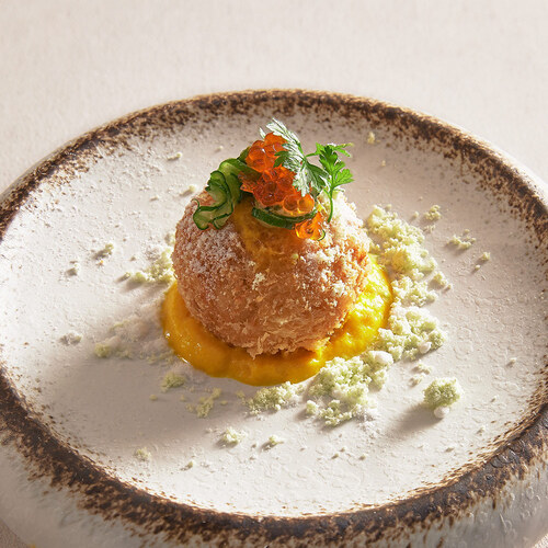 松葉蟹肉,鮭魚卵,小黃瓜,山蘿蔔葉,山葵奶油慕斯